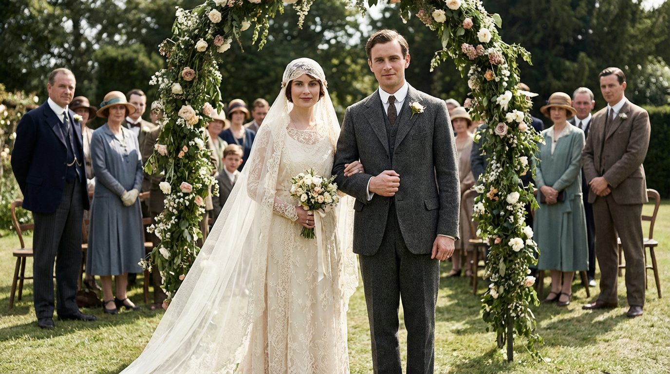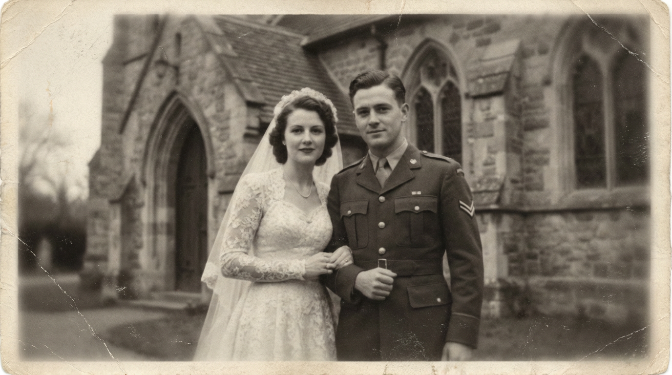 AfterA vintage wedding photo colorized by AI, bringing back period clothing and scene.