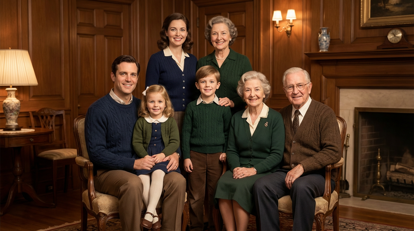 AfterA 1970s family portrait, heavily faded; AI restored color and detail.