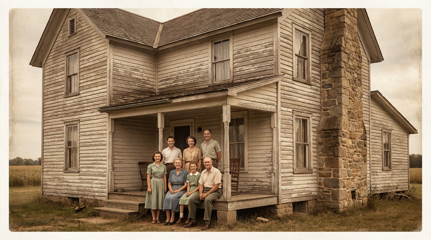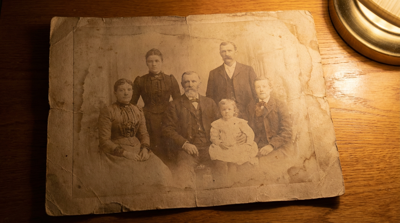 Before the old house was torn down, we found a family photo at the door. Restoring it became our way of keeping 'home'.